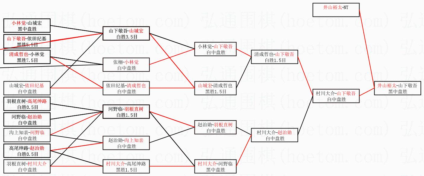 1.井山裕太获得冠军,山下敬吾获得亚军。决赛比分:井山裕太4:2山下敬吾。棋局: