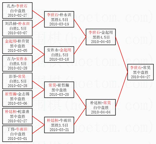 | 1.李世石获得冠军,常昊获得亚军。决赛比分:李世石3:0常昊。棋局: | ||