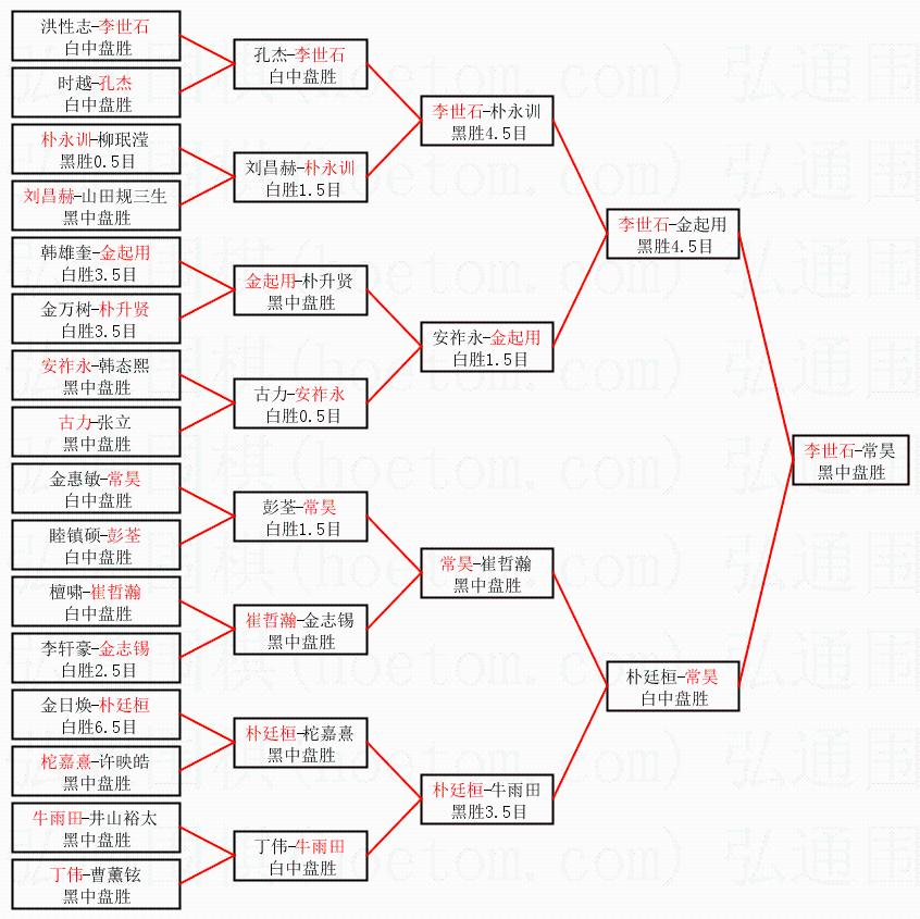 | 1.李世石获得冠军,常昊获得亚军。决赛比分:李世石3:0常昊。棋局: | ||