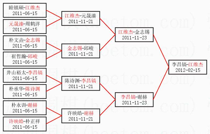 1.江维杰获得冠军,李昌镐获得亚军。决赛比分:江维杰2:0李昌镐。棋局: