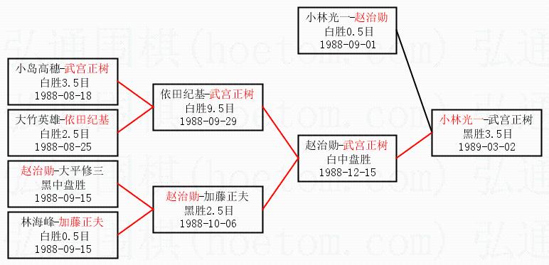 3.下半区半决赛武宫正树获胜,比分:武宫正树2:1赵治勋。棋局: