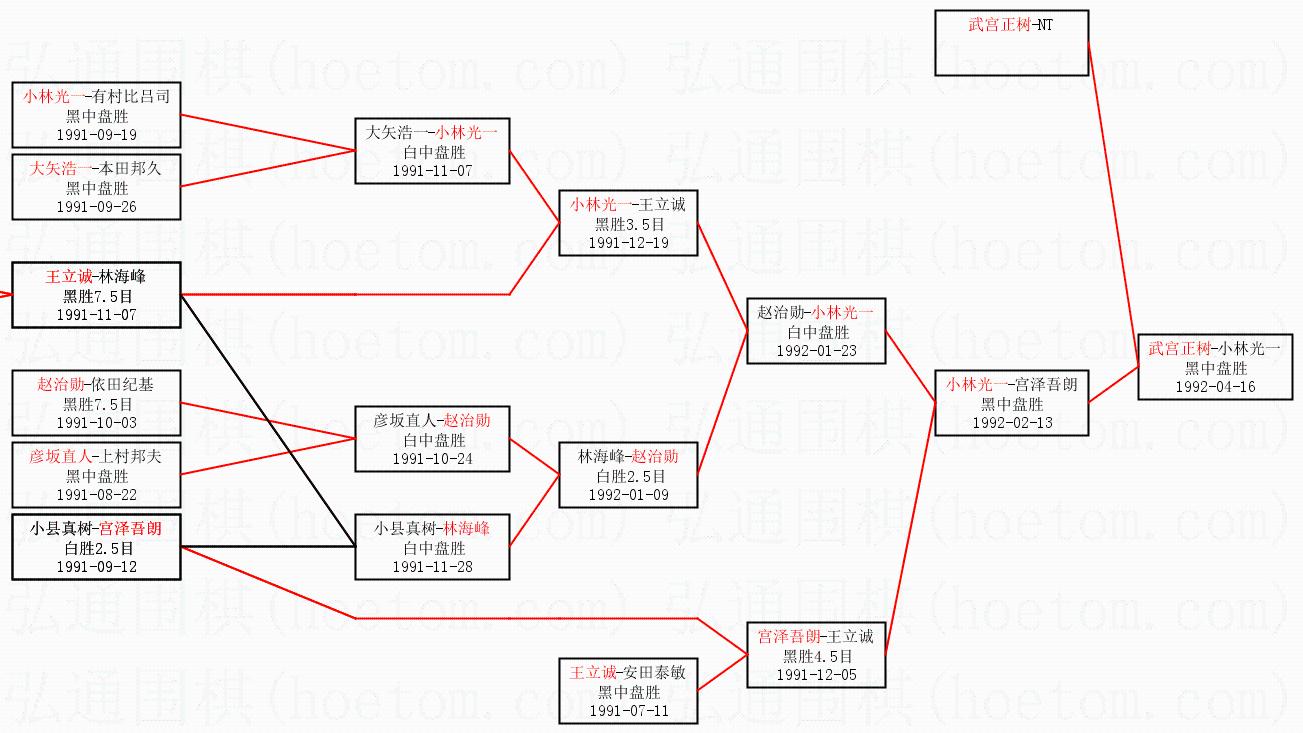 1.武宫正树获得冠军,小林光一获得亚军。决赛比分:武宫正树3:1小林光一。棋局: