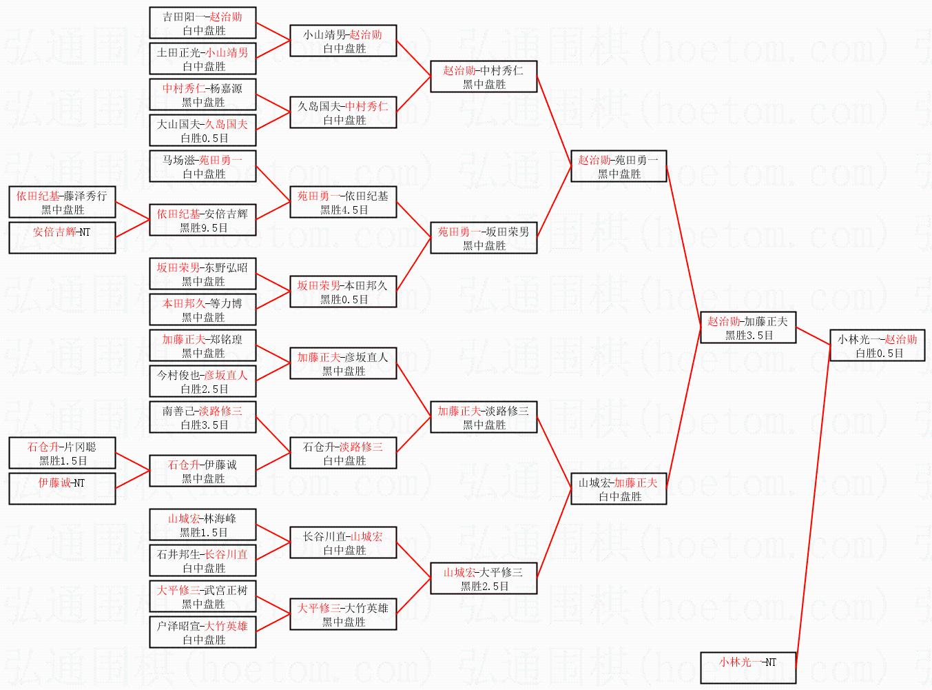 1.赵治勋获得冠军,小林光一获得亚军。决赛比分:赵治勋3:2小林光一。棋局: