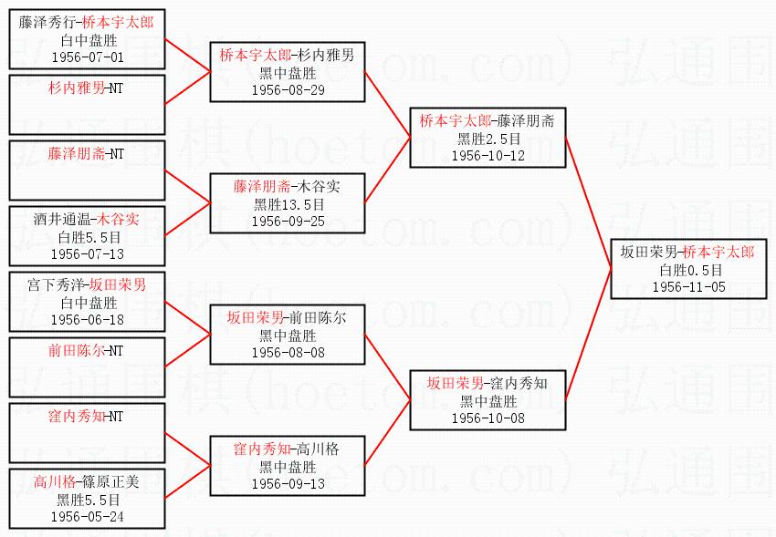 1.桥本宇太郎获得冠军,坂田荣男获得亚军。决赛比分:桥本宇太郎2:0坂田荣男。棋局:
