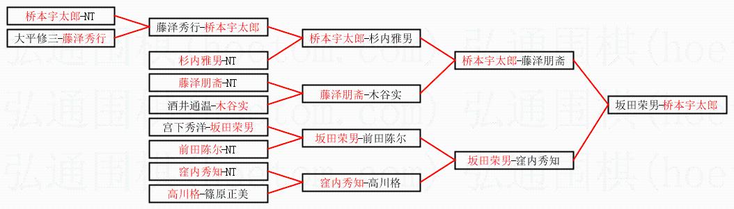 1.桥本宇太郎获得冠军,坂田荣男获得亚军。决赛比分:桥本宇太郎2:0坂田荣男。棋局:
