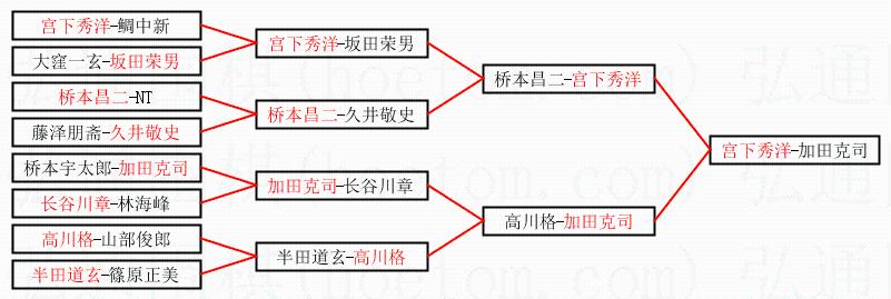 1.宫下秀洋获得冠军,加田克司获得亚军。决赛比分:宫下秀洋2:0加田克司。棋局: