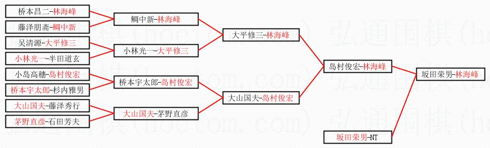 1.林海峰获得冠军,坂田荣男获得亚军。决赛比分:林海峰2:1坂田荣男。棋局: