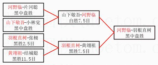 1.河野临获得冠军,羽根直树获得亚军。决赛比分:河野临1:0羽根直树。棋局: