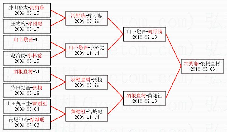1.河野临获得冠军,羽根直树获得亚军。决赛比分:河野临1:0羽根直树。棋局: