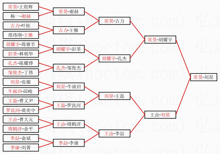 1.常昊获得冠军,刘星获得亚军。决赛比分:常昊1:0刘星。棋局: