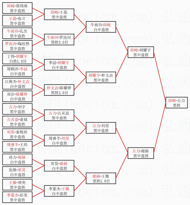 1.邱峻获得冠军,古力获得亚军。决赛比分:邱峻1:0古力。棋局: