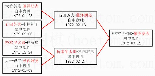 1.藤泽朋斋获得冠军,桥本宇太郎获得亚军。决赛比分:藤泽朋斋1:0桥本宇太郎。棋局: