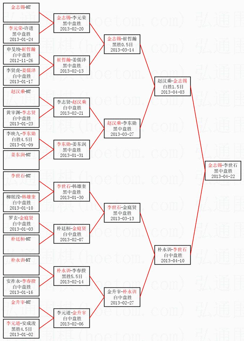 1.金志锡获得冠军,李世石获得亚军。决赛比分:金志锡3:0李世石。棋局: