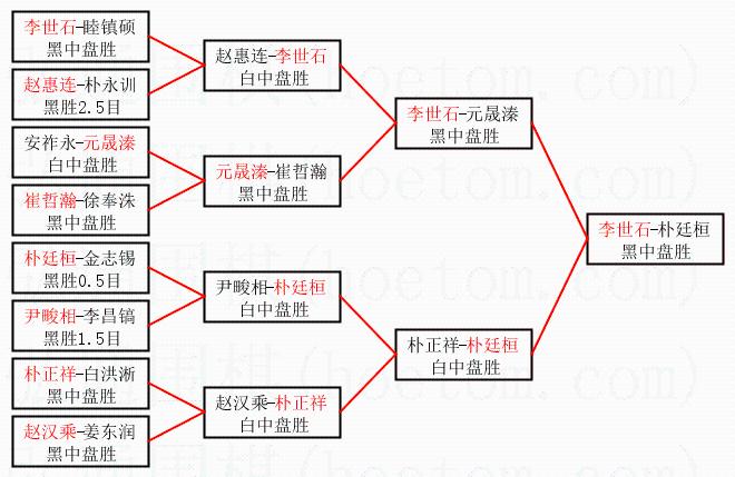 1.李世石获得冠军,朴廷桓获得亚军。决赛比分:李世石2:0朴廷桓。棋局: