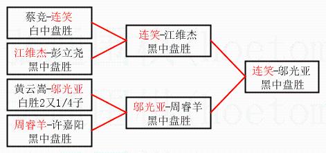 1.连笑获得冠军,邬光亚获得亚军。决赛比分:连笑1:0邬光亚。棋局: