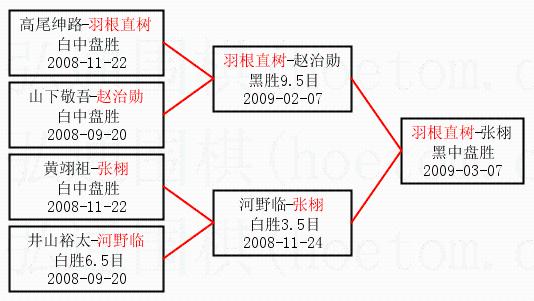 1.羽根直树获得冠军,张栩获得亚军。决赛比分:羽根直树1:0张栩。棋局: