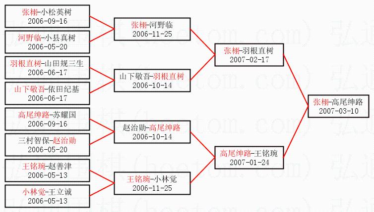 1.张栩获得冠军,高尾绅路获得亚军。决赛比分:张栩1:0高尾绅路。棋局: