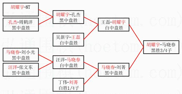 2.上半区半决赛胡耀宇获胜, 比分:胡耀宇 1:0 王磊。棋局: