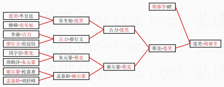 1.周睿羊获得冠军,连笑获得亚军。决赛比分:周睿羊3:1连笑。棋局: