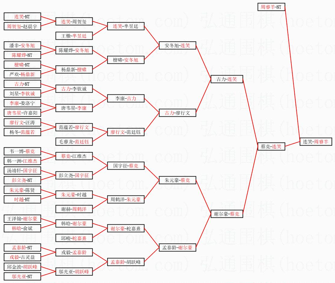 1.周睿羊获得冠军,连笑获得亚军。决赛比分:周睿羊3:1连笑。棋局: