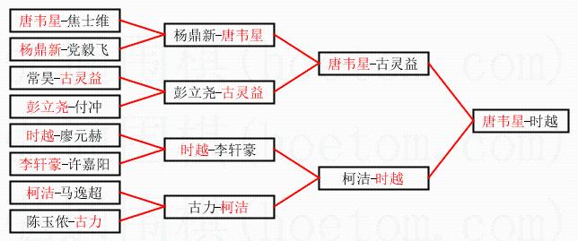 1.唐韦星获得冠军,时越获得亚军。决赛比分:唐韦星1:0时越。棋局: