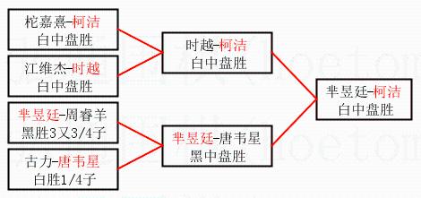 2.上半区半决赛柯洁获胜, 比分:柯洁 1:0 时越。棋局: