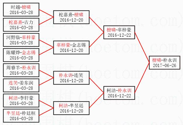 1.檀啸获得冠军,朴永训获得亚军。决赛比分:檀啸2:1朴永训。棋局: