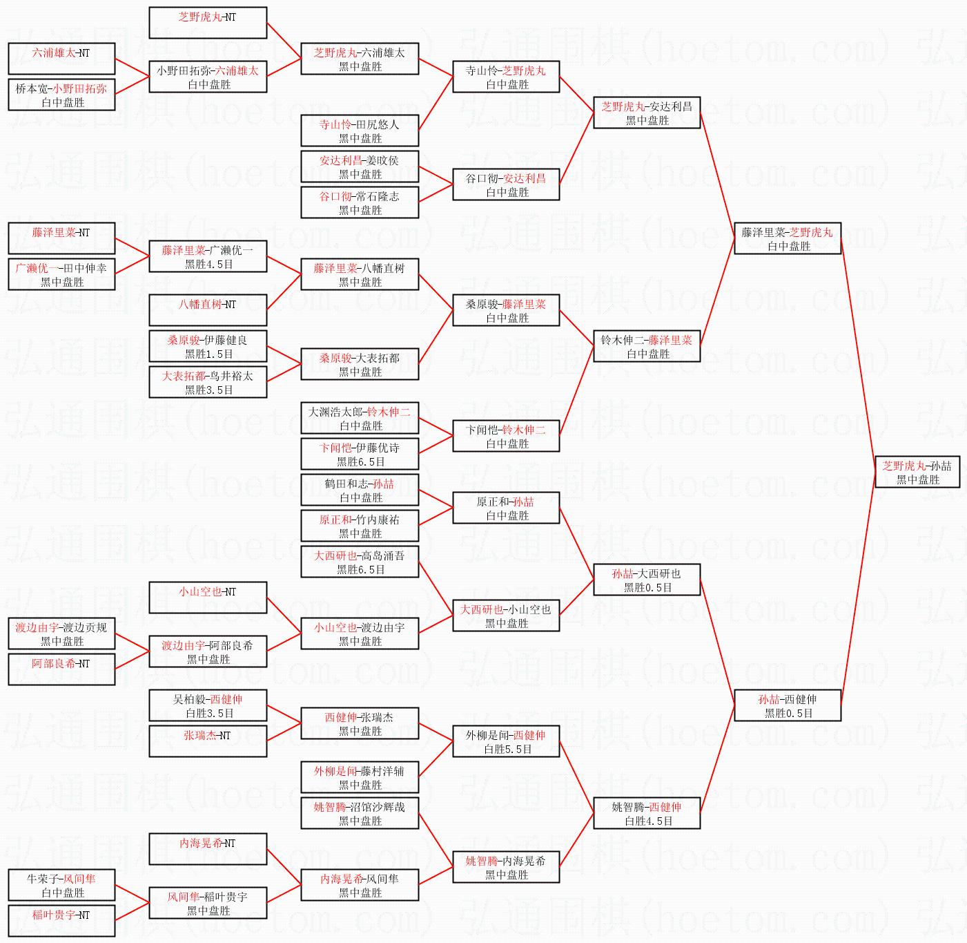 1.芝野虎丸获得冠军,孙喆获得亚军。决赛比分:芝野虎丸2:0孙喆。棋局: