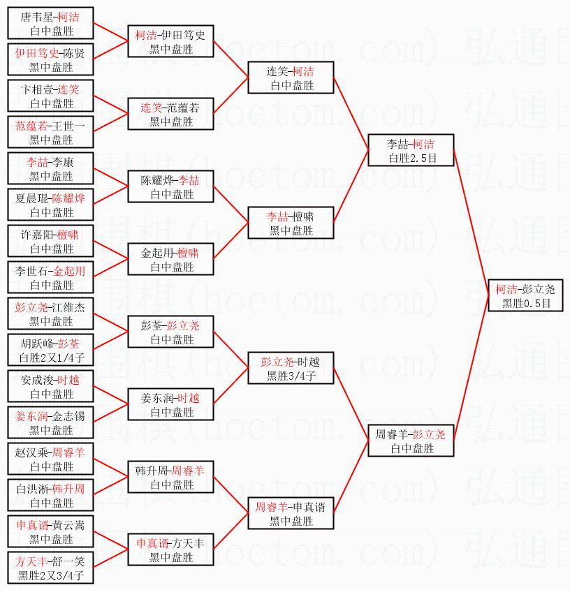 1.柯洁获得冠军,彭立尧获得亚军。决赛比分:柯洁3:2彭立尧。棋局: