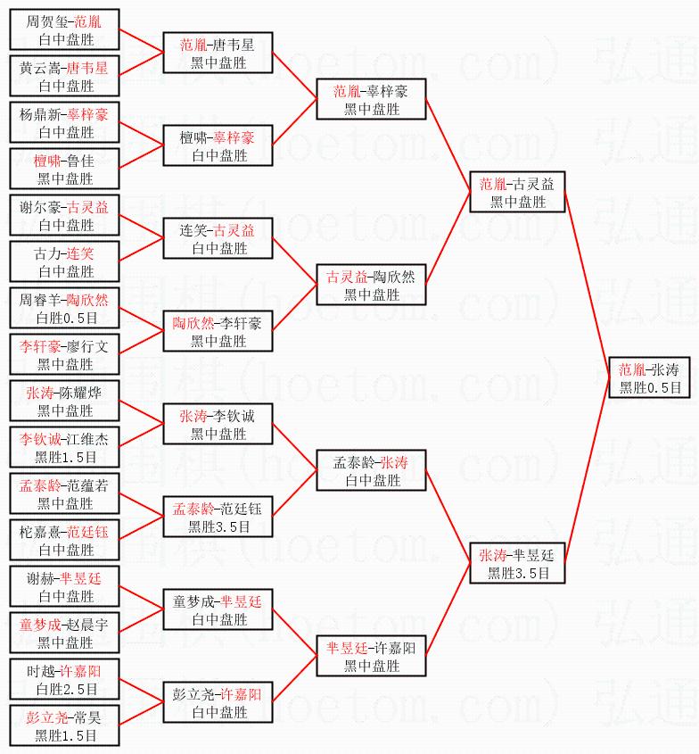 1.范胤获得冠军,张涛获得亚军。决赛比分:范胤1:0张涛。棋局: