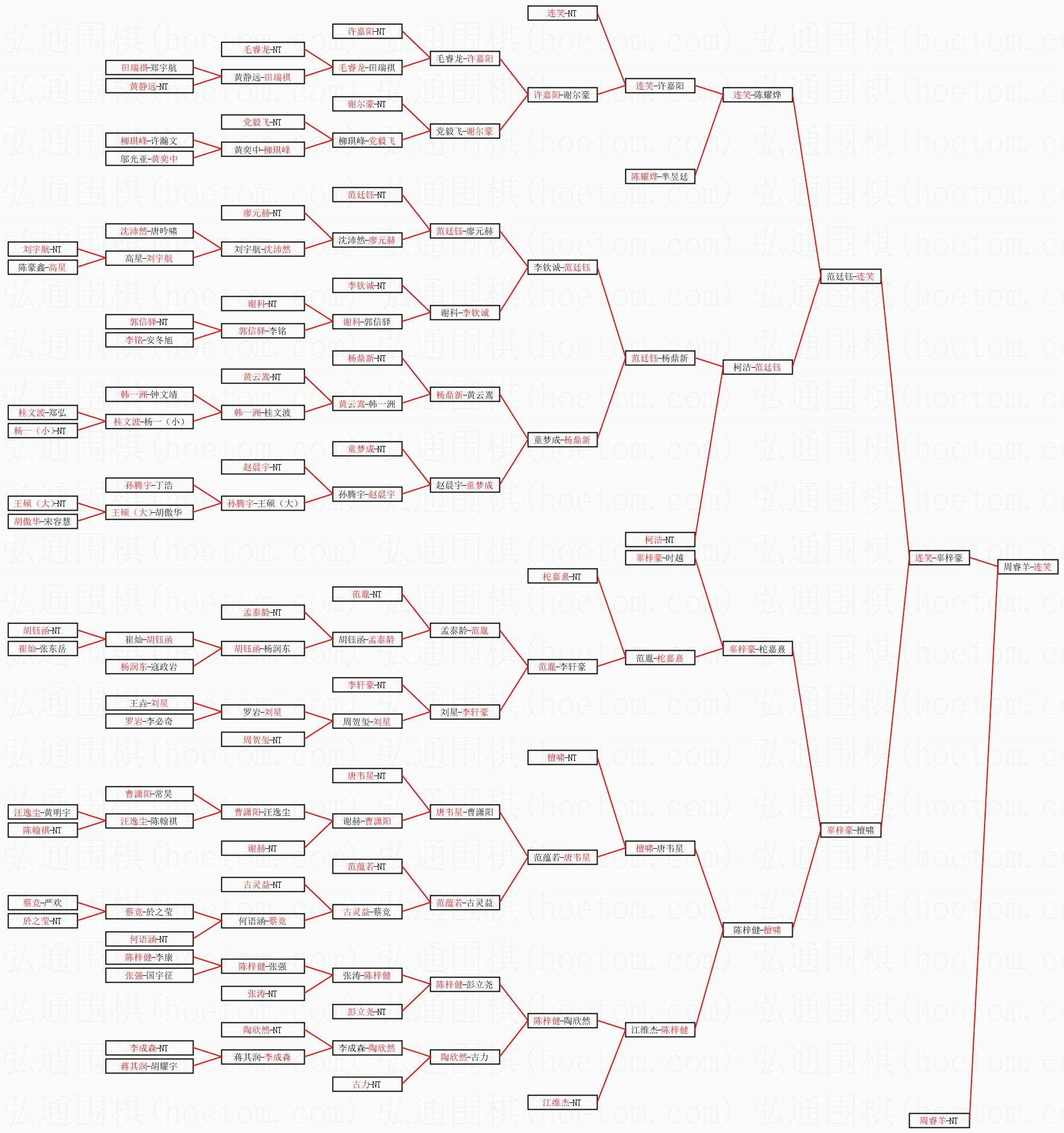 1.连笑获得冠军,周睿羊获得亚军。决赛比分:连笑2:1周睿羊。棋局: