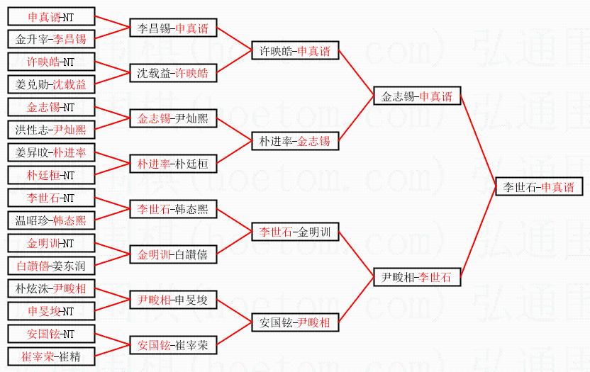 1.申真谞获得冠军,李世石获得亚军。决赛比分:申真谞3:2李世石。棋局: