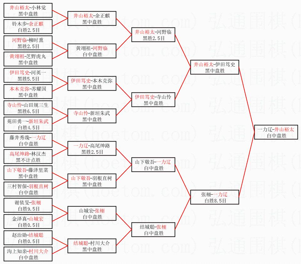 1.井山裕太获得冠军,一力辽获得亚军。决赛比分:井山裕太1:0一力辽。棋局: