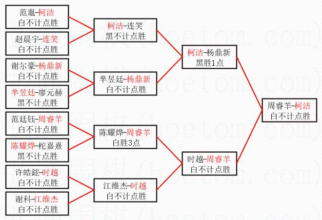 | 2.上半区半决赛柯洁获胜, 比分:柯洁 2:0 杨鼎新。棋局: | ||