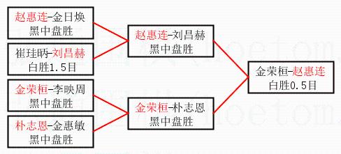1.赵惠连获得冠军,金荣桓获得亚军。决赛比分:赵惠连1:0金荣桓。棋局: