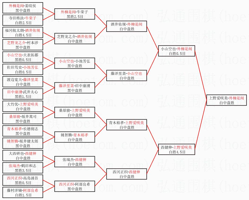 1.外柳是闻获得冠军,上野爱咲美获得亚军。决赛比分:外柳是闻2:1上野爱咲美。棋局: