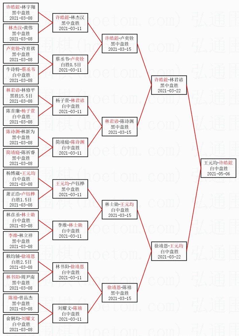 1.许皓鋐获得冠军,王元均获得亚军。决赛比分:许皓鋐4:1王元均。棋局: