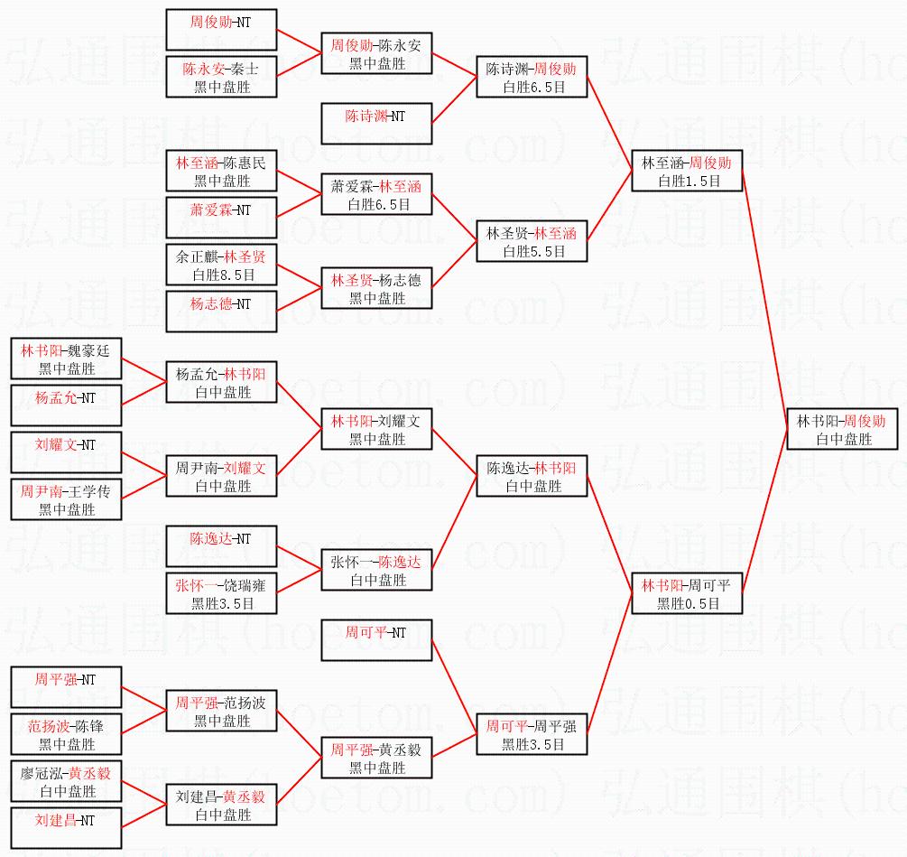 1.周俊勋获得冠军,林书阳获得亚军。决赛比分:周俊勋2:0林书阳。棋局: