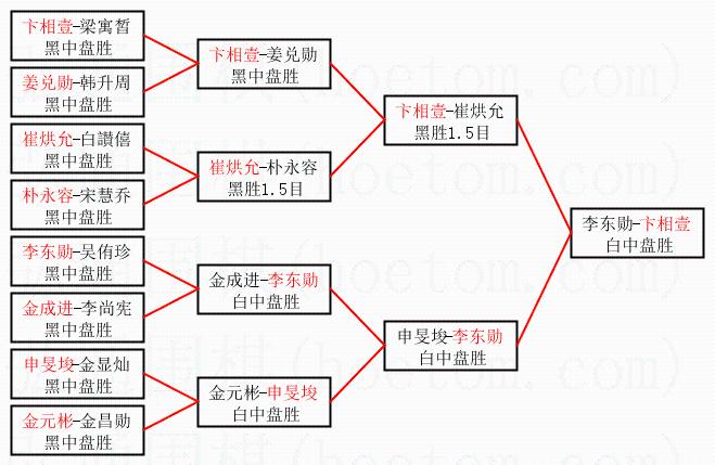 1.卞相壹获得冠军,李东勋获得亚军。决赛比分:卞相壹1:0李东勋。棋局: