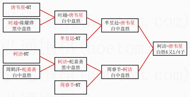 1.唐韦星获得冠军,柯洁获得亚军。决赛比分:唐韦星1:0柯洁。棋局: