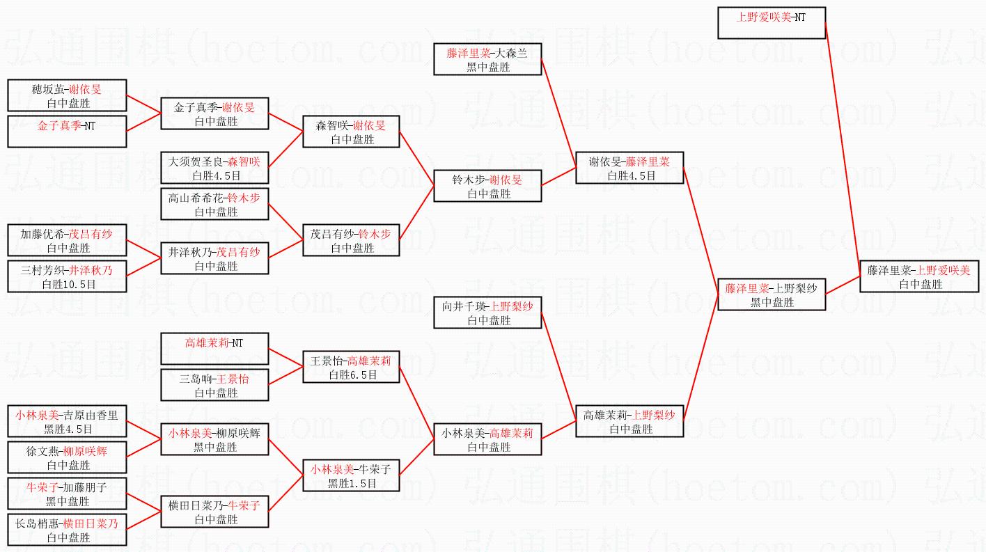 1.上野爱咲美获得冠军,藤泽里菜获得亚军。决赛比分:上野爱咲美2:1藤泽里菜。棋局: