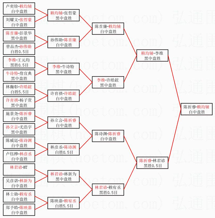 1.赖均辅获得冠军,陈祈睿获得亚军。决赛比分:赖均辅4:0陈祈睿。棋局: