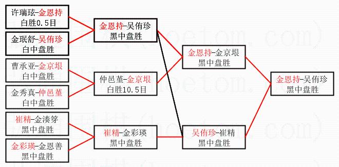 | 3.下半区半决赛吴侑珍获胜,比分:吴侑珍1:0崔精。棋局: | ||