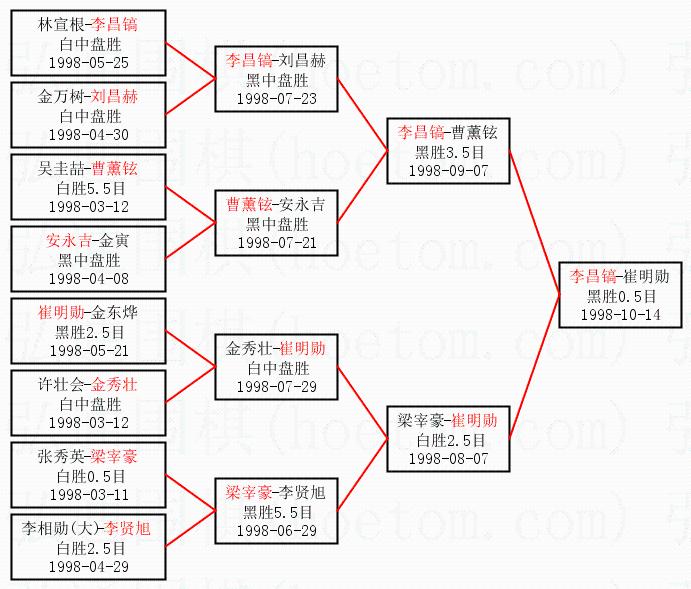 | 1.李昌镐获得冠军,崔明勋获得亚军。决赛比分:李昌镐3:0崔明勋。棋局: | ||