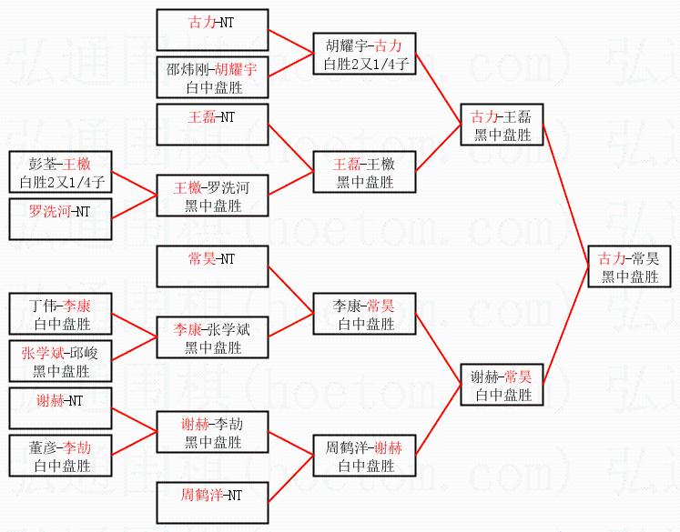 1.古力获得冠军,常昊获得亚军。决赛比分:古力1:0常昊。棋局:
