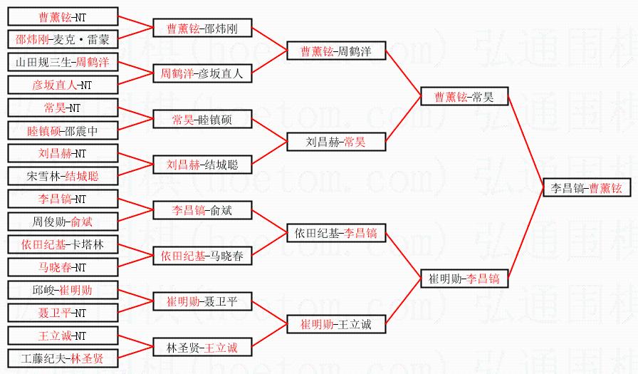 | 1.曹薰铉获得冠军,李昌镐获得亚军。决赛比分:曹薰铉2:1李昌镐。棋局: | ||
