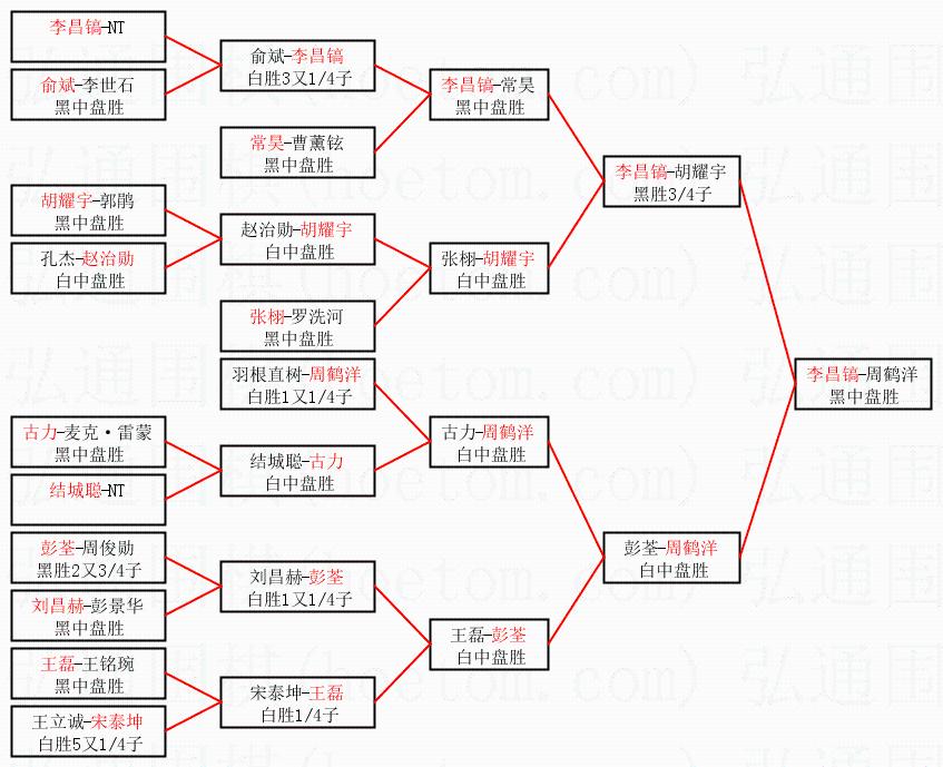 | 1.李昌镐获得冠军,周鹤洋获得亚军。决赛比分:李昌镐2:1周鹤洋。棋局: | ||