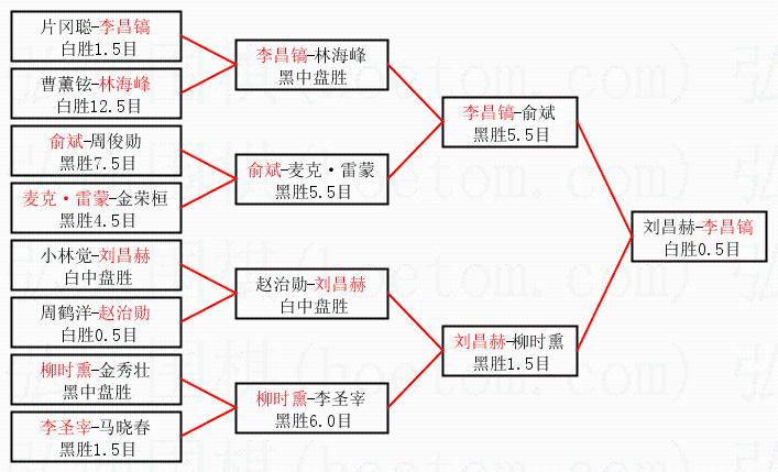 1.李昌镐获得冠军,刘昌赫获得亚军。决赛比分:李昌镐3:1刘昌赫。棋局: