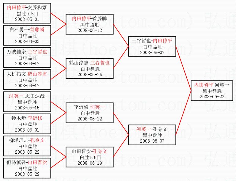 1.内田修平获得冠军,河英一获得亚军。决赛比分:内田修平2:0河英一。棋局: