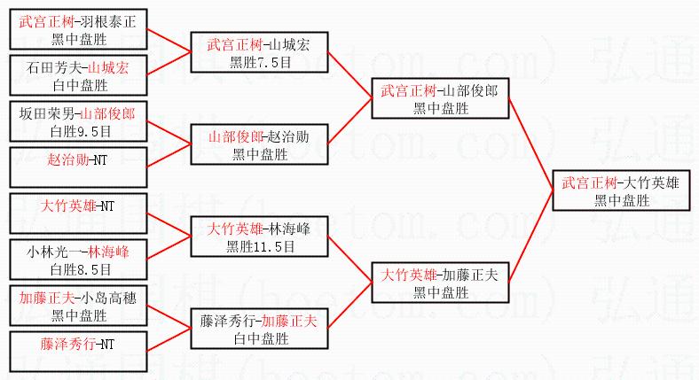 1.武宫正树获得冠军,大竹英雄获得亚军。决赛比分:武宫正树1:0大竹英雄。棋局:
